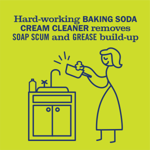 - Hardworking baking soda cleaner formula removes soap scum and grease build-up