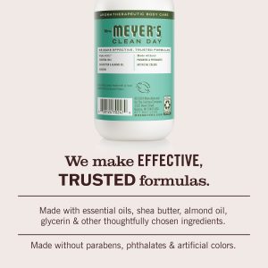 - TESTED & TRUSTED: Mrs. Meyer’s products are made with essential oils, shea butter, almond oil, glycerin, and other thoughtfully chosen ingredients that are cruelty free and Leaping Bunny Certified.