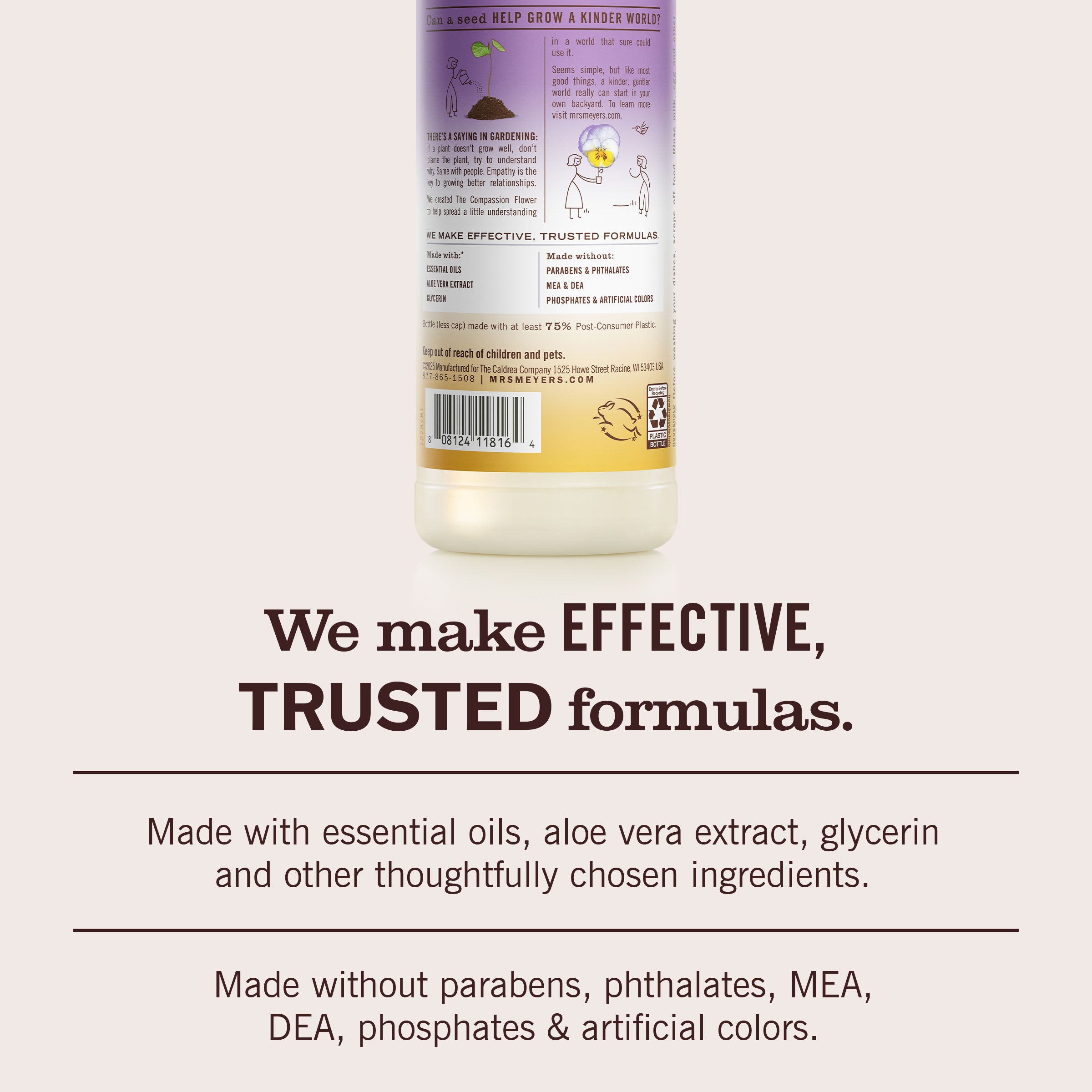 - TESTED & TRUSTED: Mrs. Meyer’s products are made with essential oils, aloe vera, glycerin, and other thoughtfully chosen ingredients that are cruelty-free and Leaping Bunny Certified.