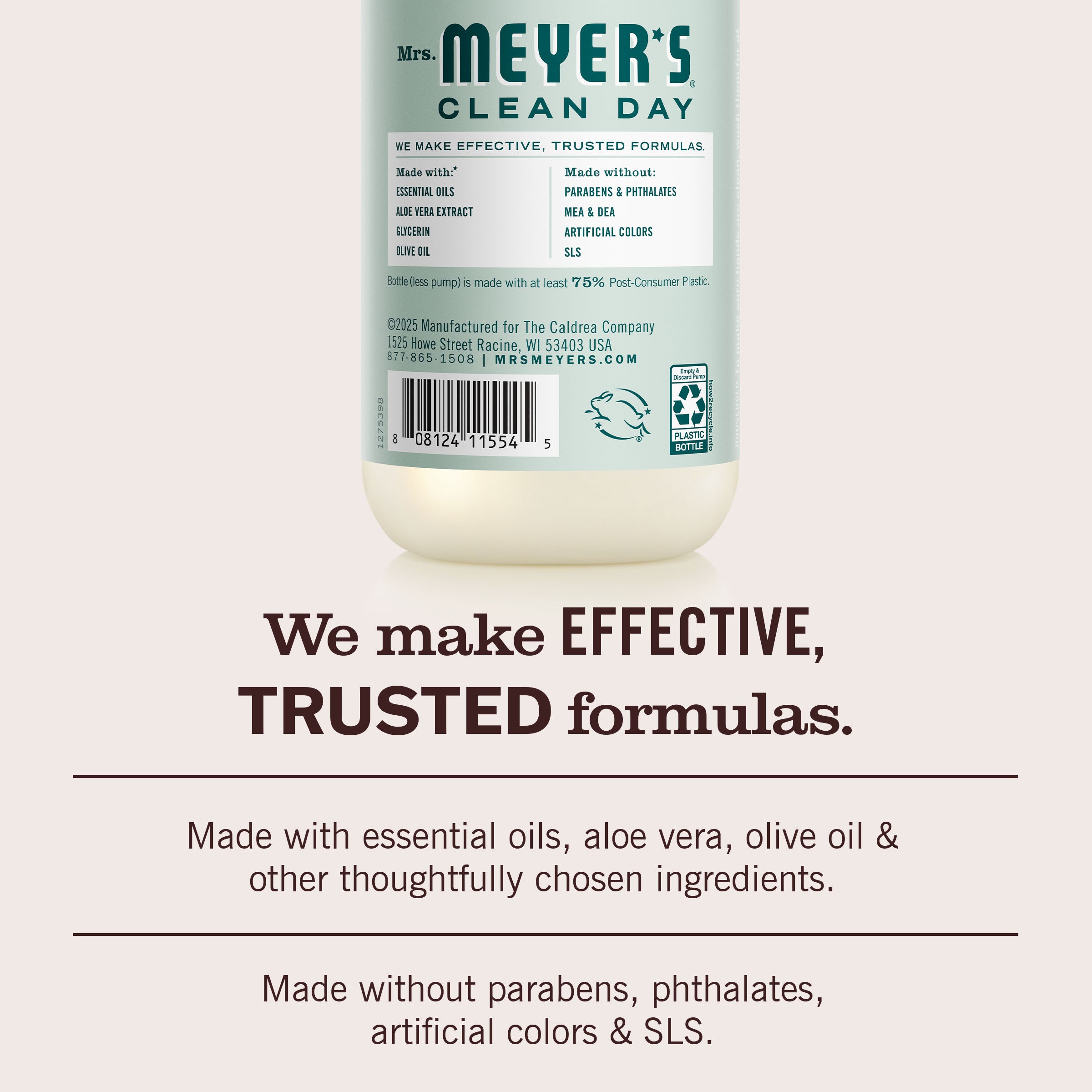 - TESTED & TRUSTED: Mrs. Meyer’s products are made with essential oils, aloe vera extract, olive oil, and other thoughtfully chosen ingredients that are cruelty-free and Leaping Bunny Certified.