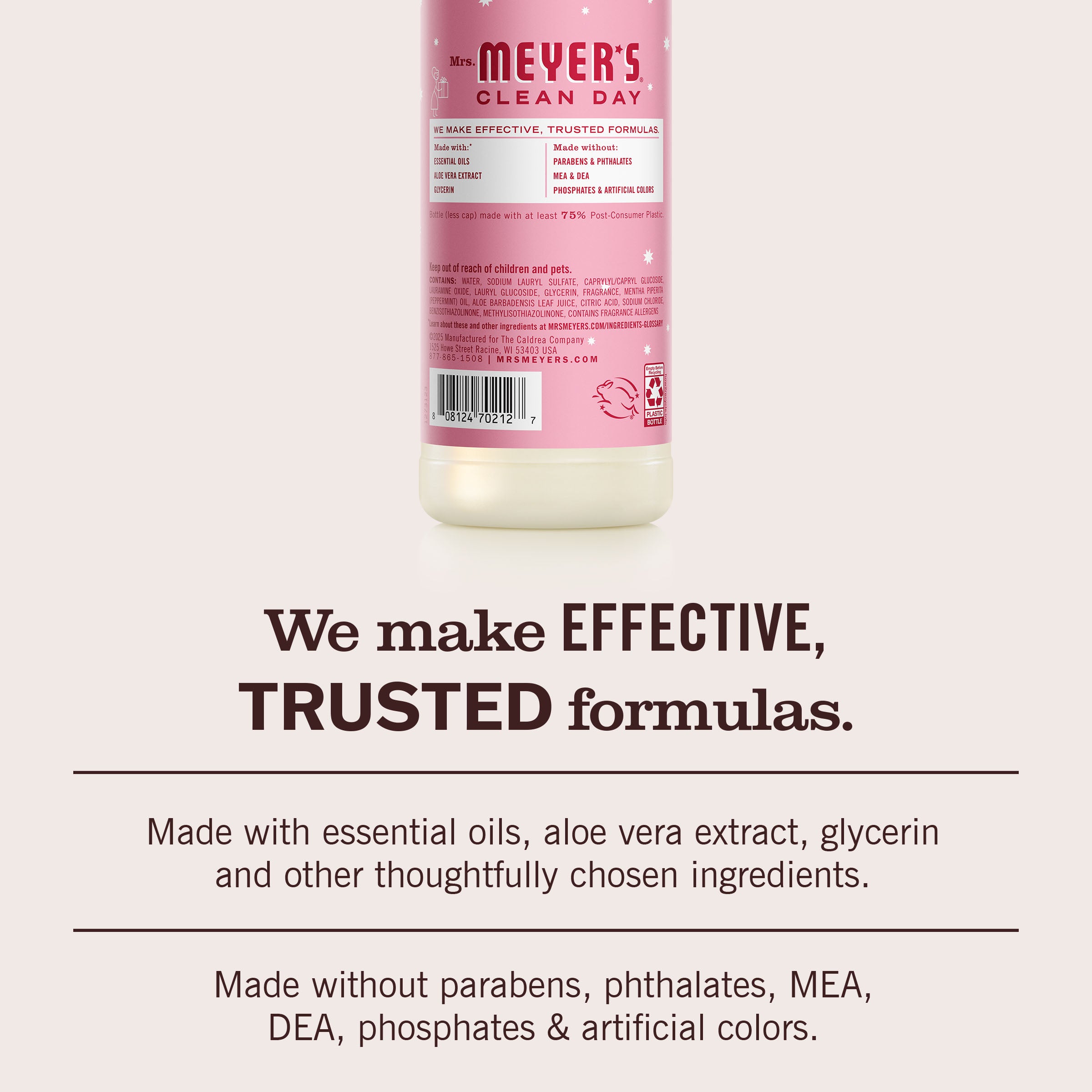 - TESTED & TRUSTED: Mrs. Meyer’s products are made with essential oils, aloe vera, glycerin, and other thoughtfully chosen ingredients that are cruelty-free and Leaping Bunny Certified.